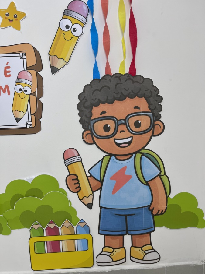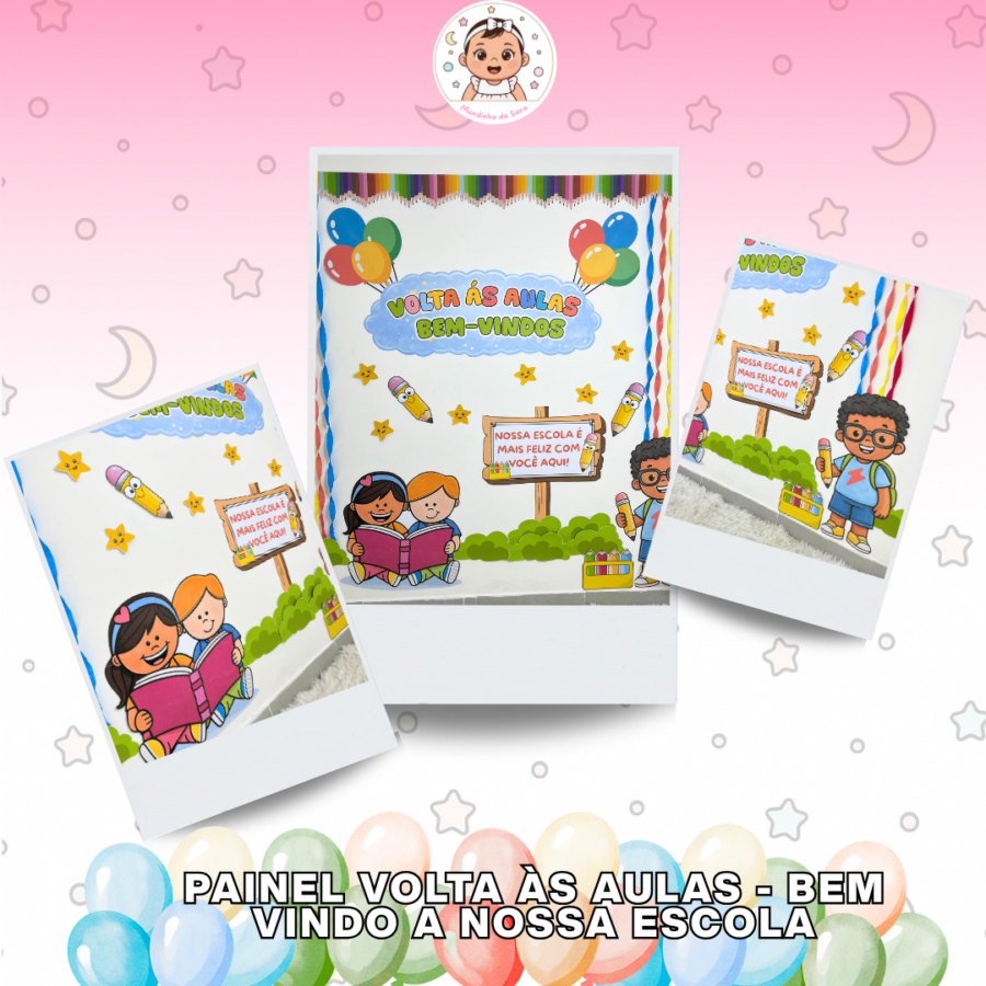 ✅ Elementos escolares e infantis (crianças, lápis fofinhos, balões, estrelas e detalhes decorativos)